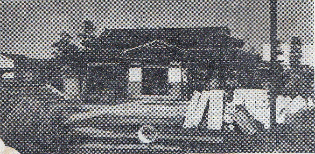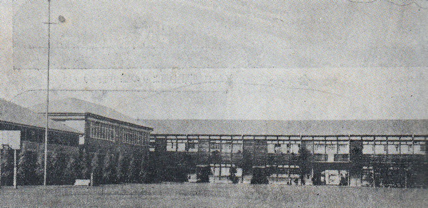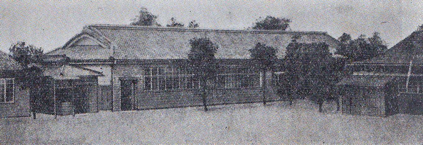 震災前の見染町校舎(見染町43番地) 左に講堂・国旗掲揚塔・理科室 |